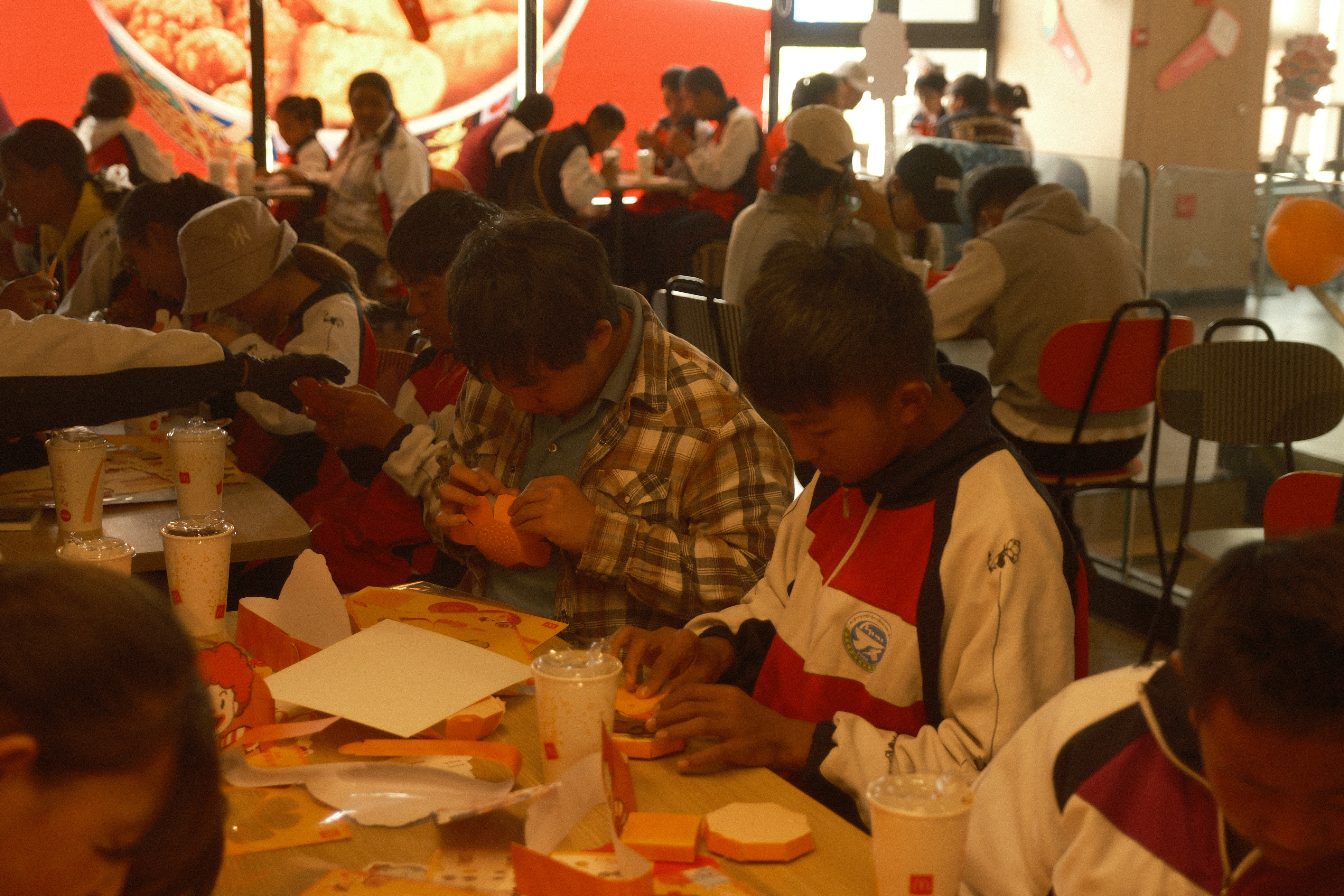 Organized by the school's teachers, Sean and the volunteers assisted in leading the children onto the bus to McDonald's in an orderly manner. Upon arrival, the volunteers, having coordinated with the restaurant in advance, ensured that the children would be served a delicious lunch as soon as they arrived. A well-prepared set of burgers and Cokes was neatly placed on the tables, waiting for the children. The restaurant not only provided tasty food but also prepared small toys for the children, such as burger origami, allowing them to enjoy both the meal and some playtime. Additionally, our student volunteers, Dolma Chodzong and Tashi Bianjor, sang a few local Tibetan songs, and the children clapped, sang along, and those who knew the songs even hummed the tunes. The entire lunch was filled with laughter, and the children's joy was contagious, filling the event with warmth and vitality.